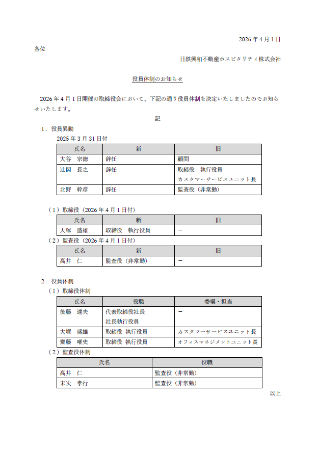 役員体制のお知らせ